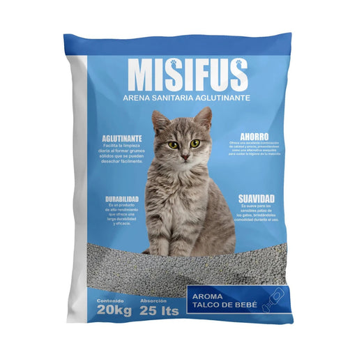 MisifusAglutinanteARENA SANITARIA AGLOMERANTE CON AROMA TALCO BEBÉ Arena Misifus Talco Bebé es una arena sanitaria aglomerante de bentonita sódica 100% natural, dise...