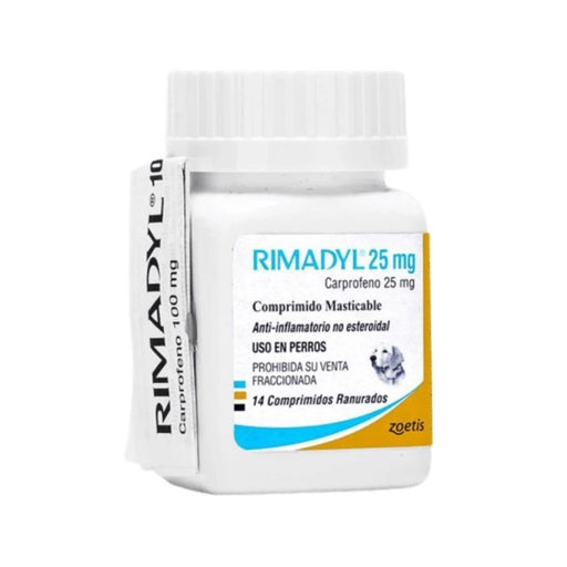 RimadylANTIINFLAMATORIO Y ANALGÉSICO PARA PERROS Rimadyl® 25 mg es un antiinflamatorio no esteroide (AINE) formulado especialmente para perros, indicado p...