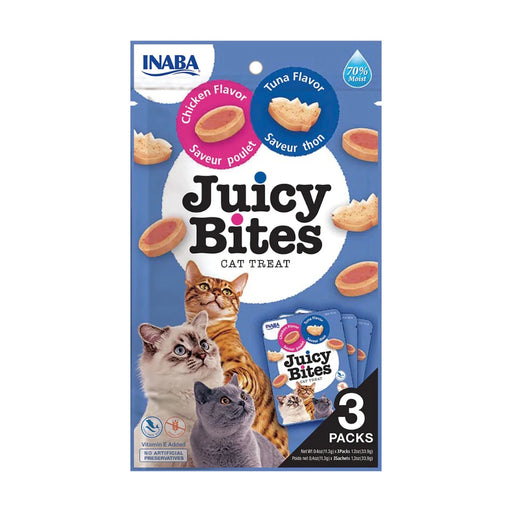 InabaSin granosSNACK BLANDO Y NATURAL DE ATÚN Y POLLO, LIBRE DE GRANOS Juicy Bites Atún/Pollo es un delicioso snack blando y natural para gatos, elaborado con ing...