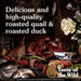 Pato (12 %), harina de pato (12 %), harina de pavo, harina de pollo, boniatos, lentejas, guisantes, grasa de pollo (conservada con tocoferoles mezclados), codorniz asada (3 %), pato asado (3 %), aceite de salmón, cloruro de potasio, minerales, arándanos azules, frambuesas, tomates, raíces de achicoria secas.